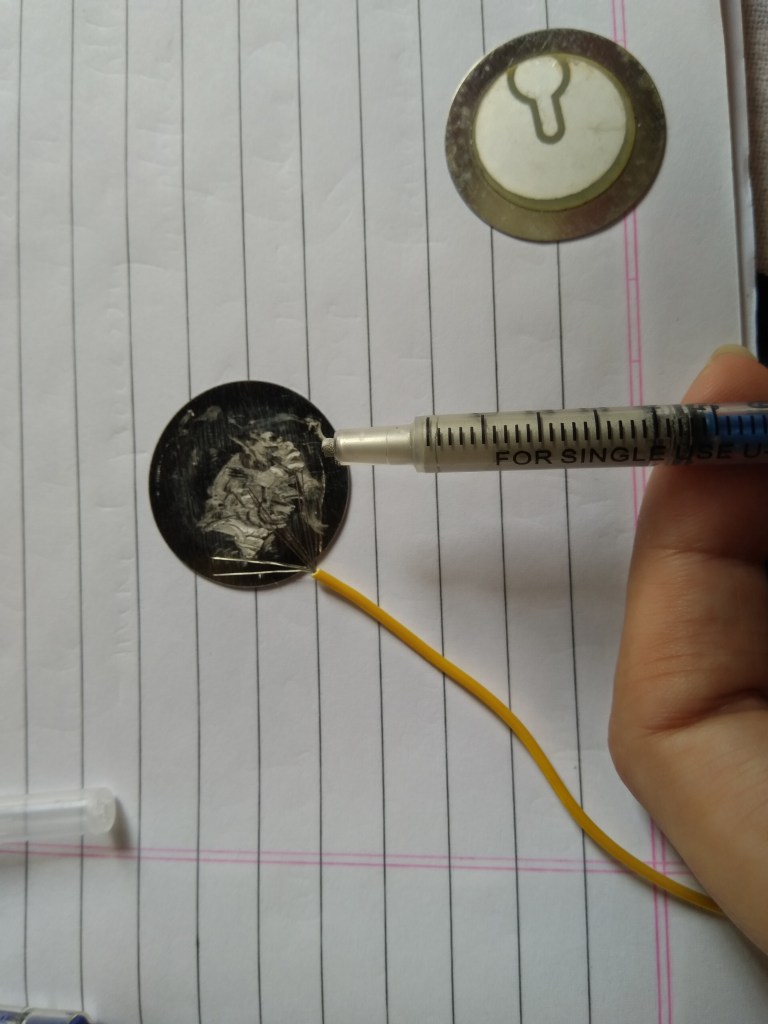So I open this pack of Silver conductive glue, this syringe with a needle and cap, which made me expect the consistency of this sliver “pulp” to be liquidly, but it was really thick. I disconnected the needle head and used it as is. (You can see the consistency, looks like a pencil tip)