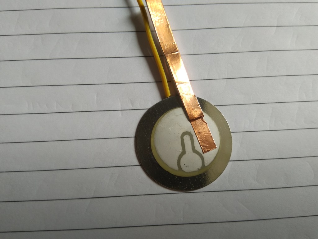 The Cu tape is split to make the short for the two electrodes of the 2 piezo disks. The paper below this Cu tape is only partially removed in order to prevent shorting with the “shield / metal plates”, later a wire will be soldered to the other end of this Cu tape.