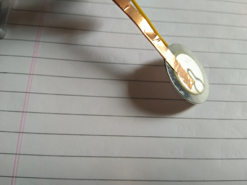Now using the Copper (Cu) conductive tape to make the second electrode. (You can solder on this electrode coted side of the piezo, but the coating tends to leave the piezo material and the electrode film gets disrupted. The temperature of the solder gun needs to be reduced to do this efficiently.)